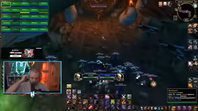 10:08:41Es wird über die T5-Raids gesprochen, wie 'Schlangenschreien' und 'Auge des Sturms'. Der Streamer erwähnt, dass 'Sulaman' und 'Sunwell' später kommen. Es wird eine Taktik für den 'Großen' Boss besprochen, der zuerst umgehaut werden muss. Es werden Stun-Anweisungen gegeben: 'Big Bites' stunn zuerst, dann 'Snacks'. Man beachtet, dass der Cooldown nur 3 Sekunden beträgt.