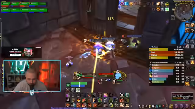 10:10:45Die Gruppe kämpft gegen 'Sieghuf'. Der Streamer erklärt, dass es '4er Cleave' gibt und man maximal 4 Ziele gleichzeitig angreifen kann. Er gibt an, dass der 'Schattenhals' hier ist und man 'Mini-Bücher' bekommen kann. Er erwähnt, dass ein Spieler runtergesprungen ist, um etwas zu 'trollen'. Es gibt Diskussionen über 'Shards' und ob man 'porten' soll.