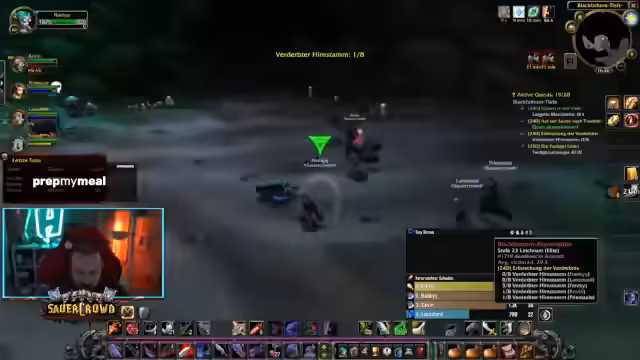 06:10:37Um 20 Uhr startet die Gruppe den geplanten Dungeon 'Verlies'. Eine eingespielte Truppe von fünf Spielern (Hunter, Dudu, zwei Krieger, Heiler) beginnt mit dem Clear. Der Streamer konzentriert sich auf das Management seines Pets und das Pullen von Mobs, während die Gruppe die ersten Räume sauber arbeitet und die Effizienz des Double-Buffs deutlich spürbar ist.
