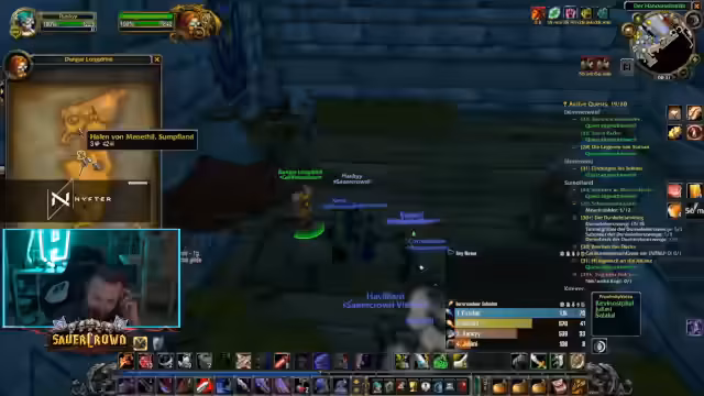 07:15:35Nach Abschluss des Dungeons macht sich der Streamer auf den Weg ins Sumpfland, um dort Level 28-Quests zu erledigen. Er plant, wieder mit der Gruppe zu questen und sieht dem geplanten Dungeon 'Burg Schattenfang' für den nächsten Tag entgegen, um spezifischen Loot zu farmen, insbesondere eine Robe für seinen Heiler.