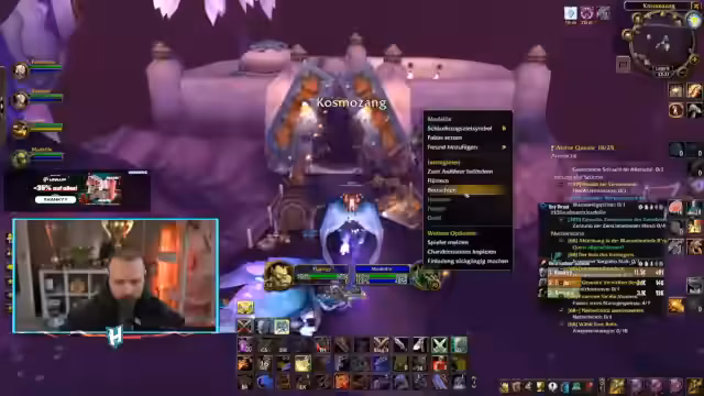 00:42:02Aufgrund seiner gesundheitlichen Beschwerden ist der Streamer verunsichert, was er essen soll, und entscheidet sich letztlich für eine Pizza statt eines riskanten Salats. Es wird im Dungeon gearbeitet. Der Streamer sucht aktiv nach einem Tank, da ein Gruppemitglied ausfällt, und wechselt selbst ins PvP-Gee, falls es benötigt wird. Die Raids für das Wochenende werden geplant, insbesondere der erste Community-Kara-Raid.