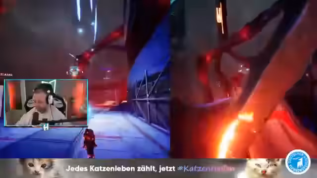 03:08:37Nach dem karitativen Teil wechselt der Stream das Spiel und startet in 'Split Fiction'. Nachdem der Streamer die Steuerung erklärt, beginnen die ersten Runden. Die Anfangsphase ist geprägt von Anpassungsschwierigkeiten an die neue Steuerung und den ungewohnten Spielmechaniken, während der Streamer und sein Team versuchen, im neuen Spiel Terrain zu gewinnen.