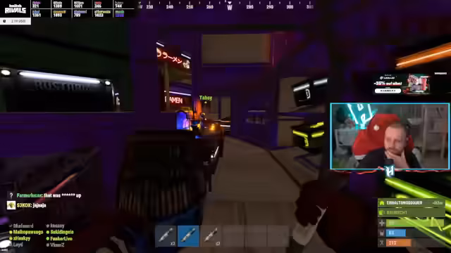 02:08:53In der Vorbereitungsphase des Rust Twitch Rivals Events stimmen sich die Spieler über Ausrüstung und Positionen ab. Sie kommunizieren über verfügbare Munition, insbesondere 5.56, und verhandeln über den Austausch von Ressourcen wie Metall und Medikamenten. Das Team versucht, strategische Positionen im Wald zu sichern und warnt vor möglichen Gegnern an Klippen. Ein Fokus liegt auf der Koordination von Bewegungen, um Überraschungsangriffe zu vermeiden, während sie versuchen, verlorenes Equipment wiederzubeschaffen und neue Sets zu sammeln.