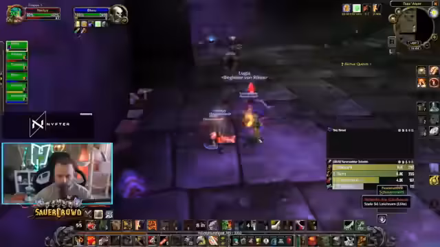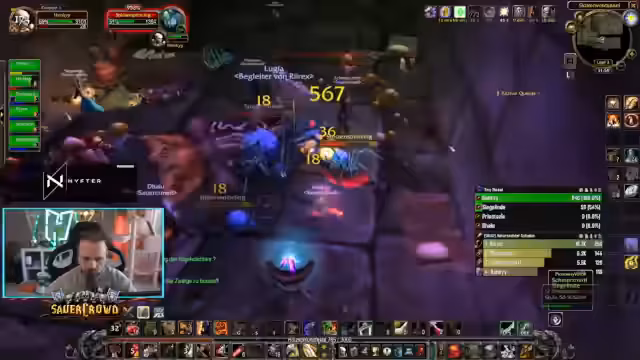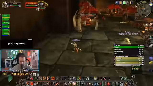 00:55:53Die Gruppe beginnt ihre Durchquerung von Lower Blackrock Spire. Es gibt eine klare Kommunikation der Pulls über Gruppen- und Raid-Chat. Der Streamer sucht nach einem speziellen Mob, dem Garok, für ein bestimmtes Rezept. Der Chat ist sehr aktiv und es gibt hilfreiche Anweisungen zur Orientierung im Dungeon. Die Gruppe ist auf 6 Leute reduziert, um einen clean Run zu gewährleisten.