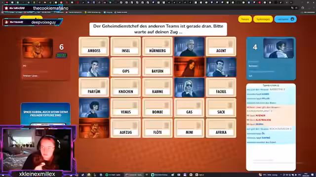 00:00:02Der Stream beginnt mit technischen Problemen. Streamer*x kann nicht sprechen und macht sich Sorgen über Sound- und Beleuchtungsprobleme. Es wird versucht, die Störungen zu beheben, während gleichzeitig das erste Spiel "Geheimdienst" vorgestellt wird. Es handelt sich um ein Wortfindespiel, bei dem Teams aus dem Spymaster und den Agenten bestehen.
