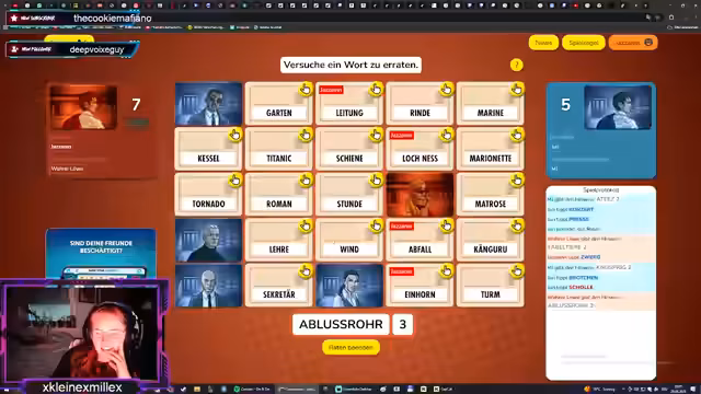 01:34:26Es folgt eine weitere Runde eines Wortassoziationspiels, bei dem Begriffe wie 'Brötchen', 'Fresse', 'Abflussrohr', 'Matrose' und 'Leitung' verwendet werden. Die Teilnehmer versuchen, die richtigen Wörter zu erraten, indem sie sie mit Konzepten aus Medien wie One Piece verknüpfen. Die Runde ist geprägt von absurden Verbindungen, humorvollen Missverständnissen und dem Versuch, vom Chat ablenkende Hinweise zu ignorieren, um fair zu raten.