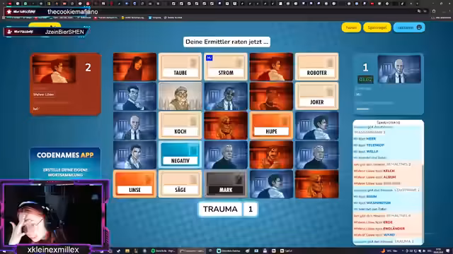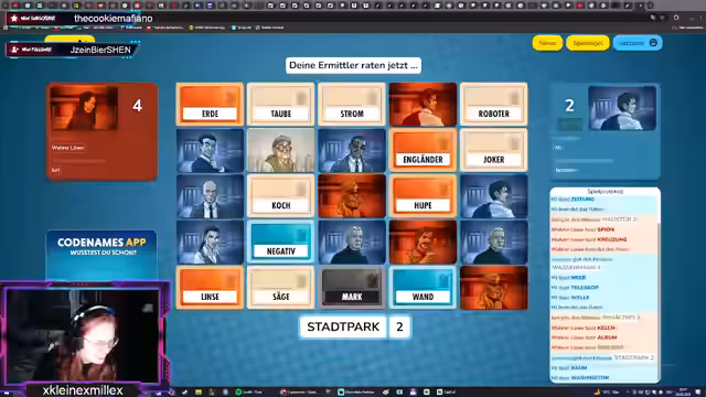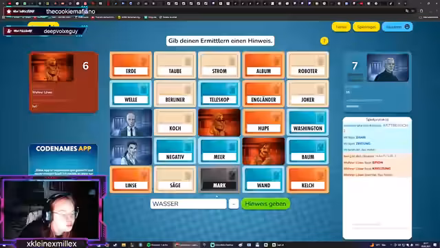02:57:24Ein Großteil des Streams ist der Interaktion mit dem Spiel 'Codenames' gewidmet. Die Spieler diskutieren intensiv über die gegebenen Hinwörter und mögliche Lösungen. Es kommt zu humorvollen Verwirrungen, wenn Wörter wie 'Teehaus', 'Kavallerie' oder 'Eier lecken' falsch interpretiert werden und der Schatzsucher um die Ecke denken muss. Dennoch gelingt es der Runde durch Kreativität und oft absurde Kombinationen, die Begriffe zu erraten und Punkte zu sammeln.