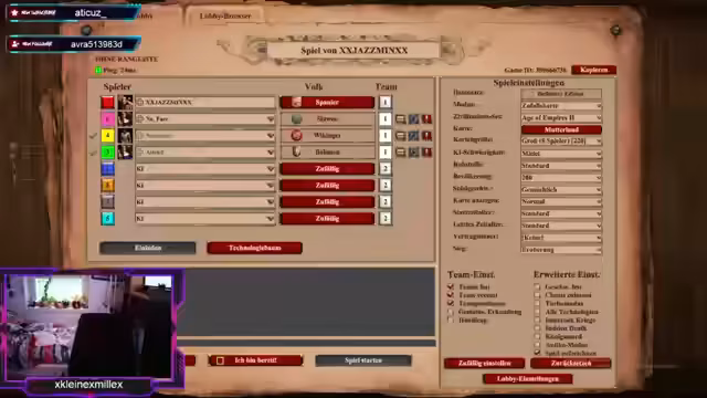 00:00:29Während die Teilnehmer auf die Installation des Spiels warten, kommt es zu technischen Problemen und verzögerten Ladevorgängen. Parallel dazu wird eine Runde UNO gespielt, bei der die Streamerin frustriert über eine langsame Internetverbindung und angebliche Unfairness im Spiel klagt. Nach diversen Unterbrechungen und technischen Anpassungen, einschließlich des Ausschaltens des Streams und eines Neustarts, wird das SpielAge of Empires endgültig gestartet und ein Lobby für alle Spieler eingerichtet.