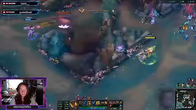 00:18:20Nach einem erfolgreichen Duell gegen eine Nidalee, bei dem sie stolz auf ein Crazy Play ist, wird ein Teamfight initiiert. Ihr Champion flasht in die Minimap, um seine passive zu aktivieren. Der Streamer ist stolz auf eine gelungene Entscheidung in der Mid-Lane, bei der sie einen gegnerischen Spieler getötet hat. Es kommt zu einem engen Fight mit einem anderen Spieler, bei dem sie knapp überleben kann. Gleichzeitig äußert sie sich über das Make-up, das sie zum Streamen aufgetragen hat und das während des Spiels verwischt.