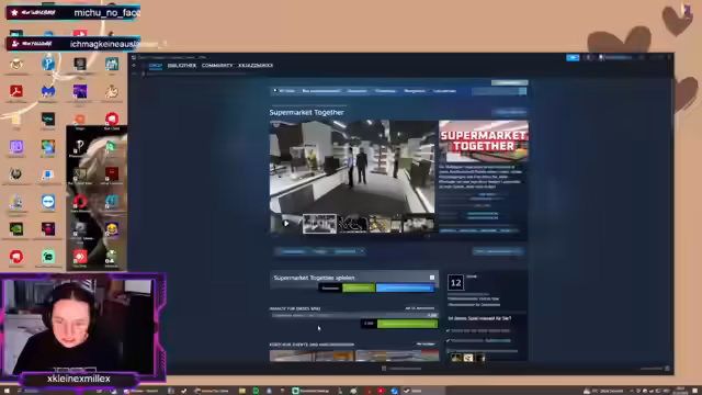 00:26:28Nach längeren Diskussionen und der Installation des Spiels starten die Streamerin und ihre Mitspieler in "Supermarket Together". Nach anfänglichen technischen Schwierigkeiten und Verwirrung über die Benutzeroberfläche gelingt es, einen neuen Supermarkt zu erstellen und zu starten. Das Team entscheidet sich für einen kreativen Ladenamen, der in pink gehalten wird, und teilt sich die Rollen an den Kassen und Regalen auf, um den Laden zu führen.