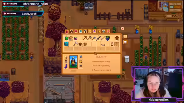 00:16:02Die Streamerin plant für ein Fest, bei dem Fische ausgestellt werden sollen. Sie sammelt Iridium-Fische wie Chub und Sea Cucumber. Es gibt eine Diskussion über die Herkunft des Fisches (See oder Fluss) und sie entscheidet, stattdessen Crispy Bass auszustellen. Zeitgleich muss sie ihre Pflanzen gießen und Quests erledigen, wie das Angeln für die Wochen-Challenge.