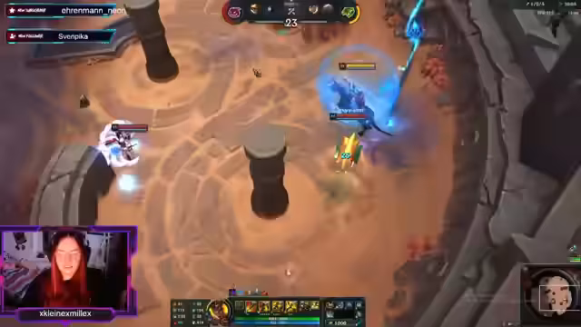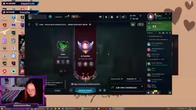 00:19:50Die Streamerin beginnt mit League of Legends, wobei sie zunächst über ihre Spielstrategien und Champion-Auswahl spricht. Sie beschreibt ihre Absichten während des Spiels, aggressiv vorzugehen, und diskutiert die Unterschiede zwischen Champion-Einheiten und Gameplay-Elementen. Während des Spiels erwähnt sie technische Hilfsmittel und Spielstrategien, wie z.B. den Gebrauch von Flash und Items. Sie kritisiert auch die Performance ihres Teams und ihre eigenen Fehler im Spiel und simuliert verschiedene Szenarien des Gameplays mit ihren Zuschauern. Dabei wird ihre Freude und Frustration über die verschiedenen Spielzüge deutlich.