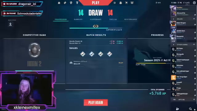 Der Spieler berichtet von Müdigkeit und dem Gefühl, krank zu werden, was er auf Schlafmangel zurückführt. Er reflektiert über seine VALORANT-Leistung und plant Verbesserungen, eventuell durch Spielen allein oder zu zweit. Er ist verwirrt über VALORANT-Begriffe und fühlt sich 'alt'. Trotzdem empfiehlt er einen emotional 'zerrissenen' Film. Er äußert Frustration über kurze Spielzeiten und Benachrichtigungen auf seinem PC. Ein Kinoerlebnis mit einem 'geleakten' Clip wird erwähnt. Er begrüßt einen Zuschauer und klärt Audioeinstellungen. Später wird er durch einen TikTok-Inhalt motiviert, live zu bleiben, obwohl er das Spiel 'hasst'. Er äußert sich zur Darstellung in JJK und kritisiert gekürzte Szenen. Die Berechnung des Rangs in VALORANT wird thematisiert, wobei er seine aktuelle Leistung als unzureichend einschätzt.