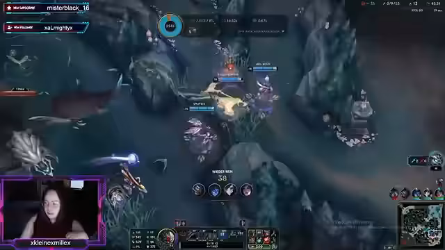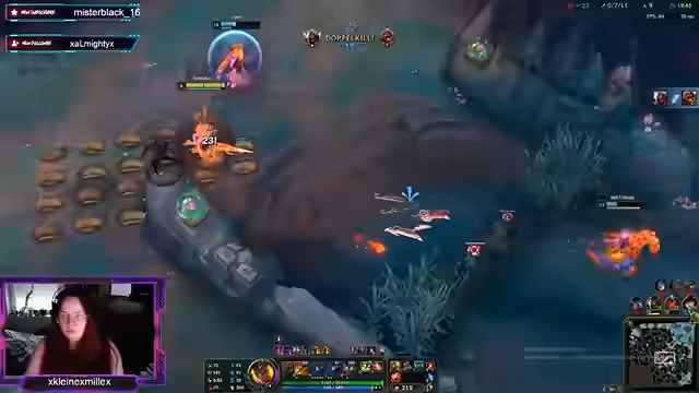03:22:25Das League-of-Legends-Spiel beginnt mit der Auswahl von Champions. Die Streamerin spielt Caitlyn und kommentiert ihr aggressives Spielverhalten. Ihr Team hat einen schwierigen Start und erlebt einige Rückschläge, verliert aber nicht den Mut. Die Kommunikation unter den Spielern ist präsent, und es gibt Momente des Erfolgs, wie das Erzielen von Assists und der Durchführung eines erfolgreichen Baron-Nashor-Kampfes.