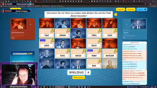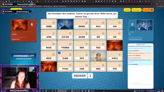 01:46:34Während des Spiels Codenames entwickeln die Teams eine Strategie. Die Streamerin als Ermittlerin gibt den Zuschauern Hinweise zu Gruppen von Wörtern, um sie auf die korrekten Begriffe zu führen. Es kommt zu humorvollen Missverständnissen, als einige Begriffe falsch interpretiert werden. Die Mitspieler raten über Wörter wie 'Reise', 'Urlaub' und 'Tequila' und müssen ihre Vorschläge begründen. Die Spannung steigt, da die gegnerische Team nahe daran ist, alle ihre Wörter zu erraten. Die Streamerin zeigt sich fasziniert von der strategischen Tiefe des Spiels und der Notwendigkeit, kreative Hinweise zu formulieren.