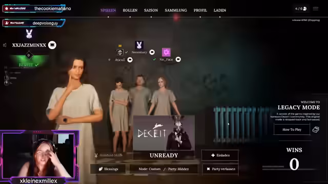 03:48:33Nach Abschluss des Wortspiels wechseln die Streamer zu einem anderen Titel mit dem Namen 'Deceit'. Das Spiel stellt eine neue, völlig andersartige Herausforderung dar, die ein Team aus unschuldigen Spielern gegen einen 'infected'-Spieler, vergleichbar mit einem Monsters oder Betrügers, in einem dunklen Szenario fordert. Die Stimmung im Stream verändert sich schlagartig von heiterer Denksport-Wette zu angespanntem, kooperativem Überlebenskampf, bei dem Vertrauen und Misstrauen eine zentrale Rolle spielen.