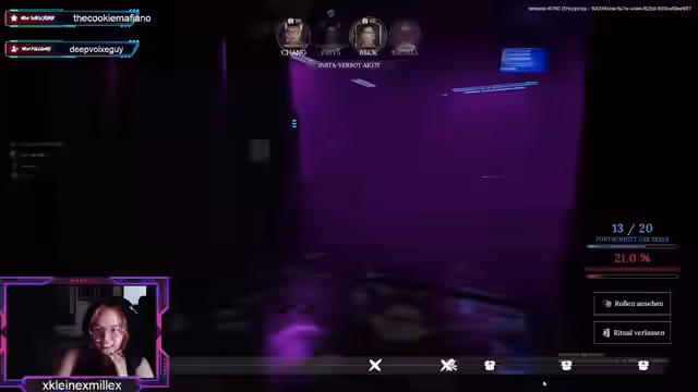 00:52:13Das Spiel Midnight Murder Club startet. Es handelt sich um ein asymmetrisches Spiel mit Rollen, in dem ein Team gegen einen anderen antreten muss. Die Streamerin und ihr Team haben anfangs Schwierigkeiten, die Spielmechanik zu verstehen, insbesondere die Steuerung und das Ziel der Runde. Es kommt zu humorvollen Missverständnissen und Tötungen. Die Streamerin wirkt fasziniert aber auch etwas überfordert von den rasanten Abläufen. Am Ende der Runde ist ihr Team nicht siegreich, und die Streamerin resümiert, dass das Spiel Spaß macht, aber bei technischen Problemen wie Latenz kaum Freude bereitet.
