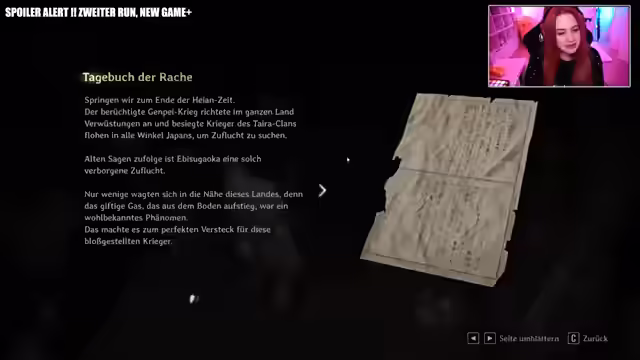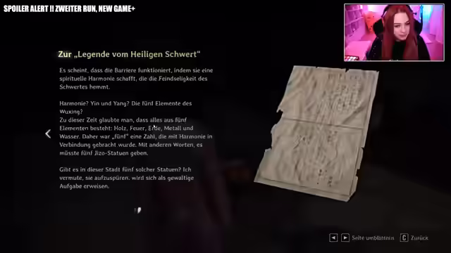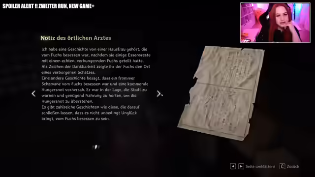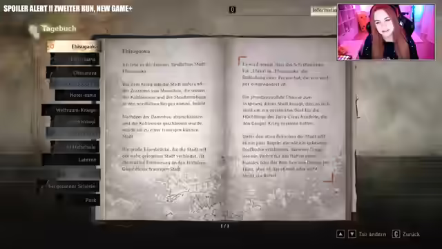 01:09:56Die Streamerin erklärt die Bedeutung des Ausdrucks 'Fuchshochzeit' und erzählt von alten Geschichten über Mädchen, die von Göttern oder Geistern entführt wurden. Sie freut sich über das Entdecken neuer Notizen im Spiel, die zuvor im Inventar fehlten. In den Notizen wird beschrieben, wie Stadtälteste Familien vermisster Töchter versicherten, diese seien von einem Fuchsfürsten entführt worden und lebten nun in Luxus. Die Inari Sama von Ebisu Gaoka wird als Schutzgottheit beschrieben, die jedoch auch Streiche spielt und Frauen entführt. Die Streamerin betont, dass es sich lohnt, New Game Plus zu spielen und dass sie versuchen wird, die Fundorte der Gegenstände im Schrein zu erwähnen. Sie liest aus dem Buch 'Exotische Kräuterkunde' vor, das von einem ausländischen Missionar nach Japan gebracht wurde und eine Medizin namens Kakura-Ma-Kakura erwähnt, die es angeblich ermöglicht, mit göttlichen Geistern zu sprechen. Sie findet ein Forschungstagebuchfoto, das sich auf die Legende vom Heiligen Schwert bezieht und die Notwendigkeit, fünf Jitsu-Statuen zu finden, um die Barriere um das Schwert aufrechtzuerhalten. Sie erwähnt auch die Geschichte von Ebisto Gaoka als Zufluchtsort für besiegte Soldaten des Taira-Clans und deren Schwur der Rache.