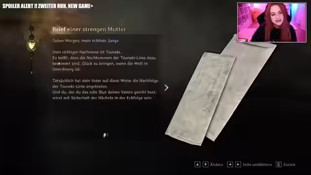 01:07:37Die Streamerin teilt eine tragische Geschichte über die Tsuneki-Familie, in der ein junger Erbe seine schwangere Verlobte Sachi verstieß, um seine Ehe nicht zu gefährden. Sachi wurde daraufhin von der Familie verstoßen und an einen abgelegenen Ort gebracht, wo sie vor Kummer Blut weinte. Das Kind, das sie trug, ein Nachkomme der Tsunekis, soll die Familie heimsuchen und Rache nehmen. Die Streamerin glaubt, dass dieses Kind beim nächsten Aufruhr innerhalb der Familie eine Rolle spielen wird und dass die Familie verflucht ist. Sie betont, dass sie die ganze Geschichte kennt und sie dem Herrn erzählen muss, um sich vor dem Fluch zu schützen. Sie äußert ihre Neugier auf Rinkos Schicksal und erklärt, dass es im Spiel ein Ende gibt, in dem ein Brief des Fuchsmanns die tragische Geschichte seiner Figur erklärt. Die Streamerin spekuliert über eine mögliche Erklärung mit Regenco und freut sich auf die kommenden Kämpfe. Sie erwähnt, dass man im New Game Plus Orte besuchen kann, die vorher nicht zugänglich waren.