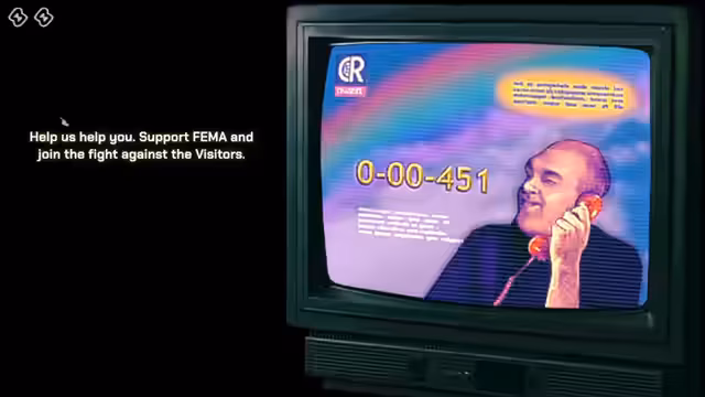 02:14:29Die Szenerie beschreibt einen bleichen Mann mit auffälligen Hautfalten und -wülsten, dessen Fleisch nicht zu seinem Körper zu passen scheint. Seine Augen sind nicht sichtbar, aber sein Blick erzeugt ein Gefühl tiefer Angst. In der Nähe liegen die Leichen von Teenagern, deren Blut noch frisch ist. Trotz dieser grausamen Entdeckung spielen der Nachbar und seine Tochter ahnungslos am Fenster, bevor sie den Horror wieder wahrnehmen. Es wird erwähnt, dass es der Tag der Gurke ist und dass die Invasion der Besucher sich beschleunigt. Die Regierung hat die Federal Emergency Management Agency (FEMA), fälschlicherweise als FETA bezeichnet, gegründet, um die Situation zu bewältigen. FEMA-Mitarbeiter tragen gelbe Schutzanzüge und Gasmasken. Die Agentur hat einen neuen Weg gefunden, Besucher zu identifizieren: Dreck unter ihren Fingernägeln, was darauf hindeutet, dass sie aus dem Untergrund kommen. Die Bevölkerung wird aufgefordert, ruhig zu bleiben und während des Tages zu Hause zu bleiben. Es folgt ein Krisenbericht über einen bleichen Verrückten, unterbrochen von Werbung. Die Werbung preist FEMA als Retter in der Not und betont, dass die Agentur bereits über 27.000 gefährliche Anomalien identifiziert hat. Bürger werden ermutigt, verdächtige Personen zu melden, auch wenn es sich nicht um Besucher handelt, und sich bei Bedarf an FEMA zu wenden.