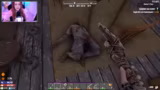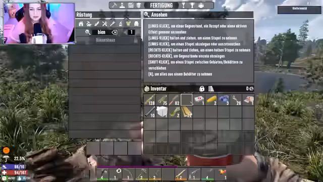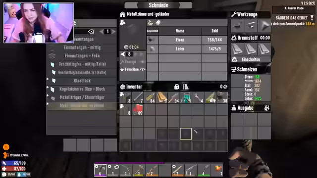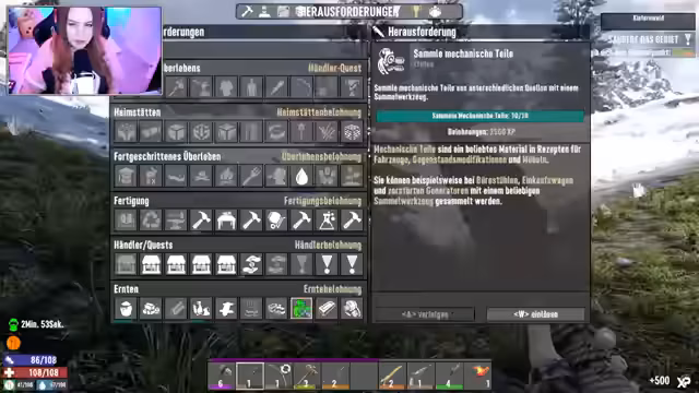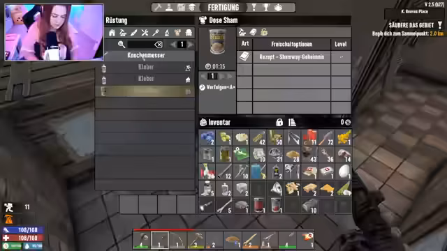 02:56:55Nach dem anfänglichen Chaos fokussiert sich der Streamer auf das Erreichen konkreter Ziele. Er verarbeitet gefundene Rohstoffe wie Messing, um Pfeile herzustellen, und beginnt, seine gesammelten Gegenstände nach und nach in Kisten zu sortieren. Er stellt fest, dass dieses System besonders in den Anfangsstufen des Spiels unausgeglichen ist und viel Aufwand erfordert. Nachdem er eine gefährliche Quest in einem anspruchsvollen Gebiet angenommen hat und dabei beinahe alle seine Vorräte und sein Leben verloren hätte, beschließt er, aus dem Risikogebiet zu fliehen. Er kehrt zu seinem sicheren Basislager zurück, um die Beute zu sortieren, sich mit Essen und Trinken zu versorgen und sich auf kommende Herausforderungen wie den bevorstehenden Blutmond vorzubereiten.