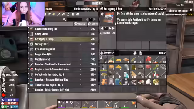 05:29:35Ein 重要er Meilenstein ist der Besuch bei einem Händler, bei dem der Streamer Gegenstände verkauft und neue Rezepte freischaltet, darunter 'Speck mit Eiern' und 'Wildbrät'. Er lernt den Umgang mit dem Handelssystem und stellt fest, dass das Sammeln von Büchern entscheidend ist, um neue Arbeitsstellen wie die Werkbank freizuschalten. Es kommt zu technischen Verwirrungen bei der Anzeige von Statistiken und der Verwaltung des Inventars, was zu humoristischen Momenten führt. Parallel dazu werden Pläne für die Herstellung von Eisenspikes und die Verbesserung der Ausrüstung geschmiedet.