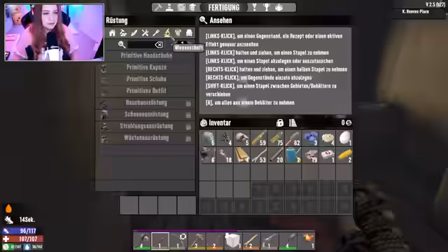 02:11:27Zu Beginn des Stream-Teils stehen die Spielemechaniken im Vordergrund. Der Streamer diskutiert Steuerungsbelegungen und die Bedeutung von Game Design, wobei er sich an Tasten wie E und Q für Interaktionen gewöhnt hat. Ein zentraler Fokus liegt auf dem chaotischen Inventar- und Itemsystem. Der Streamer kämpft mit der Organisation seines Inventars, die Trennung von wichtigen Ressourcen wie Holz, Eisen, Munition und Lebensmitteln gestaltet sich schwierig. Das Fehlen einer effizienten Sortierfunktion führt dazu, dass er Gegenstände ständig neu durchsuchen und umlagern muss, was die Effizienz erheblich beeinträchtigt und den Ablauf verlangsamt. Das Suchen nach spezifischen Rezepten oder Bauplänen wird zur Herausforderung, da er sich nicht alle Details merken kann.
