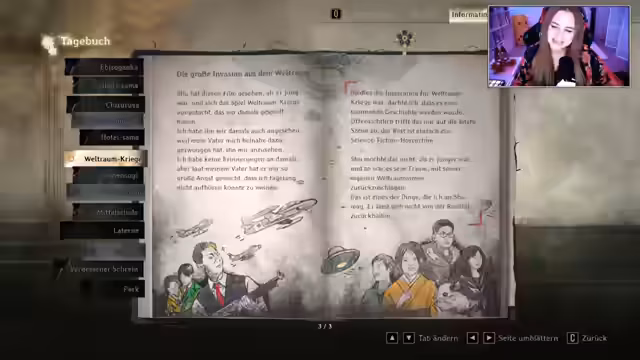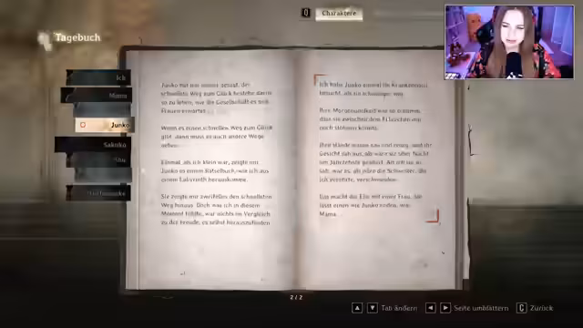 02:00:48Während des laufenden Spiels tauchen Erinnerungen und Dokumente über die Charaktere auf. Der Streamer liest ein Tagebuch eines Jungen, der von seiner Mutter ermahnt wird, nicht mit dem Mädchen von nebenan zu kämpfen, da es ihr Gesicht verletzen könnte. Dies unterstreicht die traditionelle Rolle der Frauen in der Gesellschaft. Gleichzeitig wird die Geschichte von Shus Vater thematisiert, der eine Affäre mit dem Hausmädchen hatte, was zur Geburt des Fuchsmannes führte und damit die Erbfolge innerhalb der Familie beeinflusste. Dies beleuchtet die komplexen familiären Verstrickungen und die Ursprünge des Fuchsmannes.
