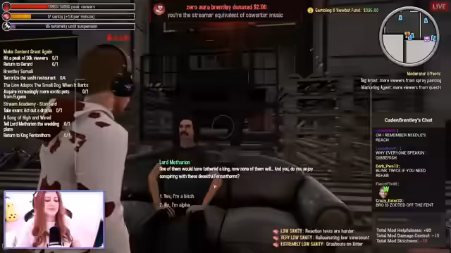 02:44:47Die Streamerin navigiert durch das Spiel mit diversen Entscheidungen, die sowohl spielerische als auch narrative Herausforderungen darstellen. Es werden verschiedene Orte wie eine Pizzeria und eine Todes Square erkundet, wobei die Charaktere durch verzwickte Situationen manövrieren. Sie versucht, ihre Sanity-Während zu managen und interagiert mit NPCs, deren Dialoge oft sarkastisch oder unvorhersehbar sind.