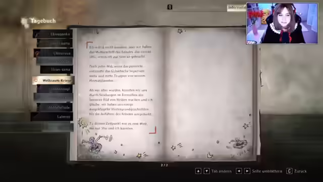 01:52:27Die Schule gefällt der Protagonistin am besten. Sie kündigt an, dass die Folgen des vorherigen Streams ab heute auf YouTube verfügbar sind, in großzügig geschnittenen Episoden von etwa 1,5 Stunden Länge. Nach einer kurzen Pause setzt sie die Erkundung fort und findet einen Weg, eine heilige Tür zu öffnen. Sie äußert sich besorgt über labyrinthartige Strukturen und ist erleichtert, einen Speicherpunkt zu finden. Sie sucht nach einem fehlenden Objekt, um ein Gerät zu aktivieren und eine weitere Tür zu öffnen. Die Streamerin findet das fehlende Objekt und aktiviert das Gerät, wodurch sich eine Tür öffnet. Sie äußert ihren Unmut darüber, dass die Erkundung wieder zeitlich begrenzt ist. Sie kehrt zurück und stellt fest, dass sich etwas verändert hat. Sie findet eine weitere Tür, die sich geöffnet hat, und entdeckt Kollege Schnürschuh. Sie benötigt nun das Häschen, um weiterzukommen. Sie liest einen Brief von Rinko an Hinako, in dem Rinko Hinako ermutigt, sie selbst zu sein und sich nicht um die Meinung anderer zu kümmern. Sie liest einen Tagebucheintrag, in dem Rinko ihre Gefühle für Shu beschreibt. Sie liest einen weiteren Tagebucheintrag, in dem Rinko ihre Freundlichkeit betont und ihre Absicht erklärt, auf Hinako und Sakoko aufzupassen.
