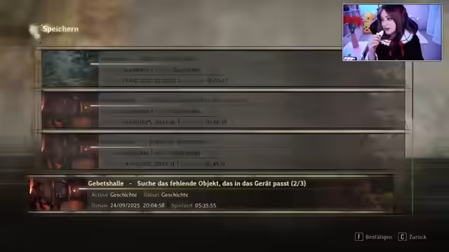 03:02:51Die Streamerin setzt ihre Erkundung in Silent Hill F fort und interagiert mit verschiedenen Objekten und Rätseln. Sie findet einen Fessellampenschirm und einen Krallenlampenschirm, die beide für ein Rätsel relevant zu sein scheinen, bei dem es darum geht, Licht zu verhüllen. Außerdem entdeckt sie einen Kaninchen-Wappenschlüssel, der möglicherweise eine Tür öffnen kann. Nach einer ekligen Szene sucht sie nach einer Möglichkeit zu speichern und kehrt zu den Spinden zurück, um nach Hinweisen zu suchen, wobei sie sich fragt, ob sich diese in einer Schule befinden. Nachdem sie eine rote Pille gefunden hat, um sich zu heilen, speichert sie das Spiel und bereitet sich darauf vor, einen Bereich zu verlassen, wobei sie Gegenstände auf einem Podest ablegt, um Erinnerungen nicht mitzunehmen. Sie äußert die Vermutung, dass eine kleine Schwärmerei zwischen zwei Charakteren bestehen könnte, schwankt aber zwischen Freundschaft und mehr.