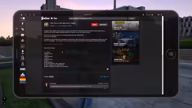 00:19:22Der Streamer beschreibt seine Anreise zu verschiedenen Orten in der Spielwelt. Er erwähnt, dass er mit einem Taxi zum VPD fährt, um einen Kollegen abzuholen und danach Geld abzuholen. Er beschreibt auch seine Teilnahme an einer Schlange, um Alamonia-Tickets zu erhalten. Dabei erwähnt er, dass er mit seinem Charakter Ariane in der Stadt unterwegs ist und sich über die lange Schlange beschwert. Er erwähnt auch, dass er seine Katze vermisst und neidisch ist, dass sie auf jemand anders Bauch liegen darf. Während dieser Erledigungen interagiert er auch mit anderen Spielern und Charakteren.