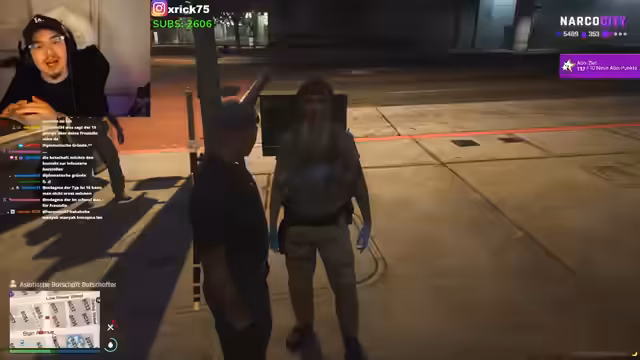 07:07:46In einem inszenierten Rollenspiel schlüpft der Streamer in die Rolle eines verhafteten Mannes, der von einem fiktiven Polizisten wegen angeblicher Entführung einer Frau verhört wird. Die Situation wechselt zu einem diplomatischen Anliegen, bei dem sich der Streamer als "asiatischer Botschafter" ausgibt, um Kontakt zur "Infanterie" herzustellen, was jedoch im Sande verläuft.