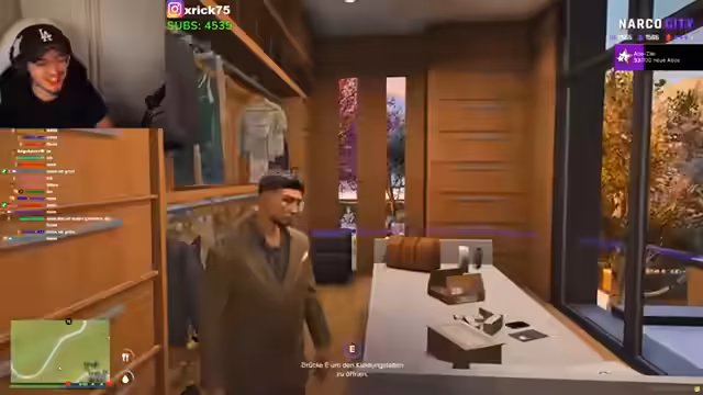 04:30:51Nach der intensiven und dramatischen Verhandlungsszene findet ein abrupter Themenwechsel statt. Der Fokus verlagert sich plötzlich auf die Vorstellung eines sanierten oder neu gestalteten Gebäudes. Der Streamer preist eine Luxus-Suite im oberen Stockwerk an, die mit einem riesigen Aquarium, Sauna, Whirlpool und einem Laufsteg für Events ausgestattet ist. Er betont seinen Status als VIP-Kunde und Investor und zeigt sich stolz auf die Einrichtungen.