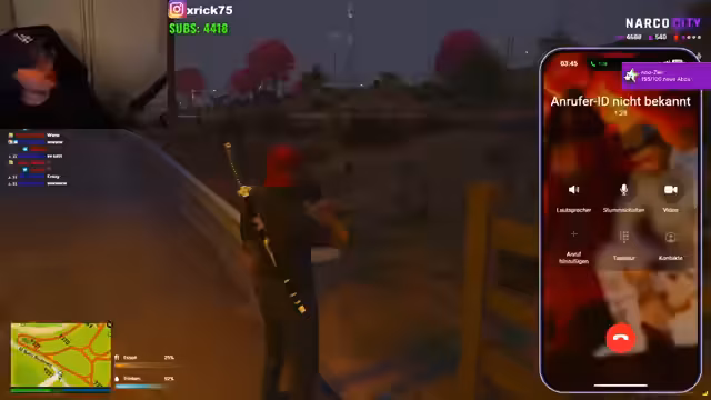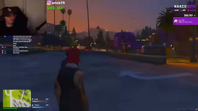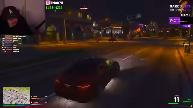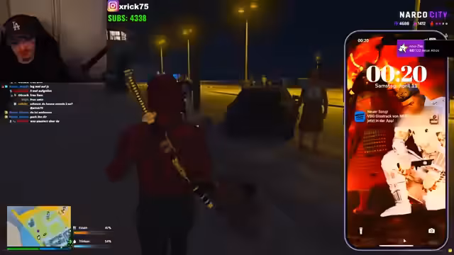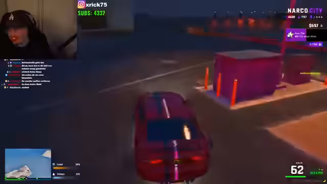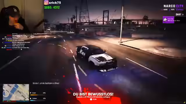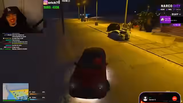 05:02:39Der Fokus verlagert sich komplett auf das Gameplay im GTA-RP Server. Der Streamer plant Rennen, tauscht Wetten über hohe Geldsummen aus und ist im ständigen Wettbewerb mit anderen Spielern. Er macht sich über die Autos und Fahrkünste seiner Gegner lustig, während er selbst auch aggressive und riskante Fahrmanöver durchführt. Spannung entsteht, als er von einem Gegner namens Jersey erwartet, der aber nicht erscheint, was ihn frustriert. Der Chat wird als Waffe im Konflikt genutzt, um den Gegner einzuschüchtern.