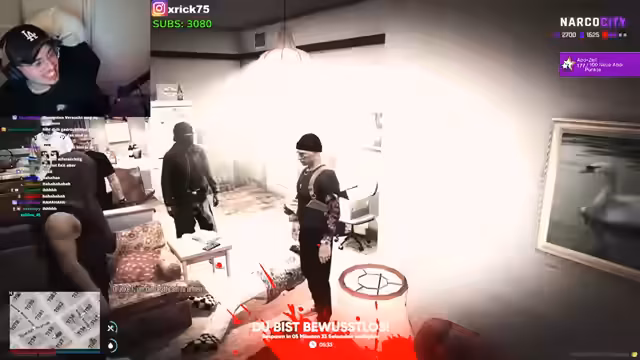 03:12:10Die Spannung erreicht einen gewalttätigen Höhepunkt. Es kommt zu Schüssen, Auseinandersetzungen und dem Ruf 'ich hab ihn gefickt'. Nachdem die Gegner geflohen sind, werden Personen gefesselt und als Geiseln gehalten. Der Streamer redet von 'verpiss dich' und 'ich fick dich gleich', was eine brutale und feindselige Stimmung vermittelt.