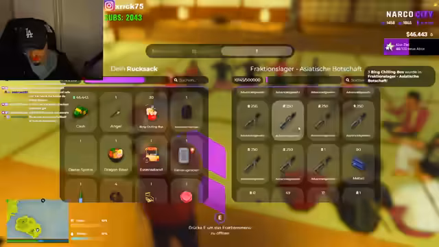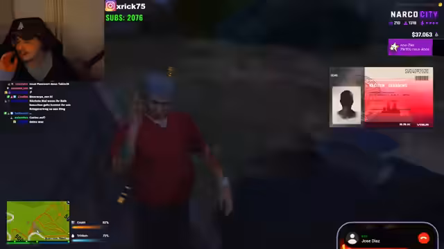 01:44:48Luciano meldet sich mit dringender Bitte beim Streamer und berichtet von der Übernahme einer Drogenkolonne durch Konkurrenten, die 100 Dildos statt Kokain enthielten. Er weist darauf hin, dass sein gesamtes Kokain vor einem Verkauf der Rote bereits abgegeben wurde und bietet 20% der erbeutten Güter an. Luciano fordert dann sofortige Hilfe bei einem kritischen Problem, er erwähnt von Chiolinski, der ebenfalls mit dem Streamer sprechen möchte, und gibt an, 72 Millionen Schwarzgeld erhalten zu haben.