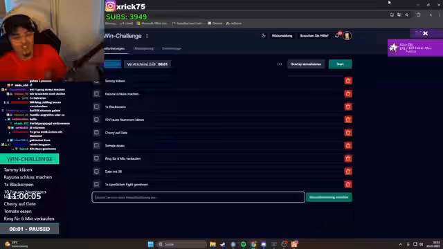 00:11:27Nach einer Unterbrechung geht es mit einem Casino-Spiel weiter, bei dem das Geld verdoppelt werden soll. Es kommt zu einem Zocken auf Rot und Schwarz, wobei der Streamer den Chat nach Votes fragt und große Summen einsetzt. Parallel dazu werden diverse Challenges angekündigt, darunter Dates mit Frauen, das Finden von Personen und das Gewinnen von Kämpfen.