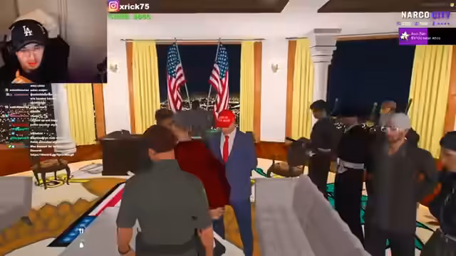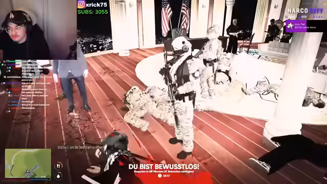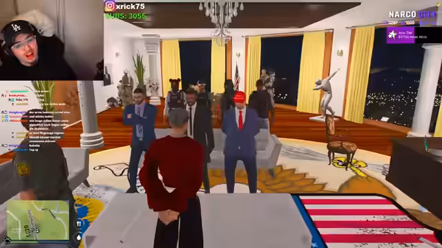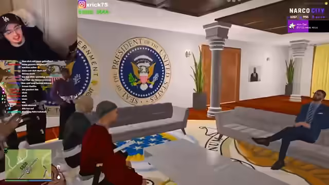 03:32:33Die Gruppe versammelt sich vor dem DOJ, wobei alle Waffen abgelegt werden müssen, da sie sich in einem neutralen Bereich befinden. Es wird über die Kleidung und die Notwendigkeit, sich im Samurai-Outfit zu präsentieren, gesprochen. Die Gruppe plant, zum Weißen Haus zu fahren, um dort mit dem Außenminister zu verhandeln. Es wird enthüllt, dass der Streamer mit Donald Trump gesprochen und vorgeschlagen hat, dass Asiaten in der Politik besser wären und einen Bürgermeisterkandidaten stellen könnten. Dies führt zu Spannungen und dem Plan, Cobain in den Ruhestand zu schicken. Die Gruppe trifft sich am Weißen Haus, um die Verhandlungen fortzusetzen, wobei der Außenminister aufgrund einer Sushi-Rolle zusammenbricht. Die Situation eskaliert, als ein Vertrag über eine Zwangsheirat diskutiert wird, der nicht unterschrieben wurde. Die Gruppe droht mit weiteren Konsequenzen, sollte der Vertrag nicht eingehalten werden.