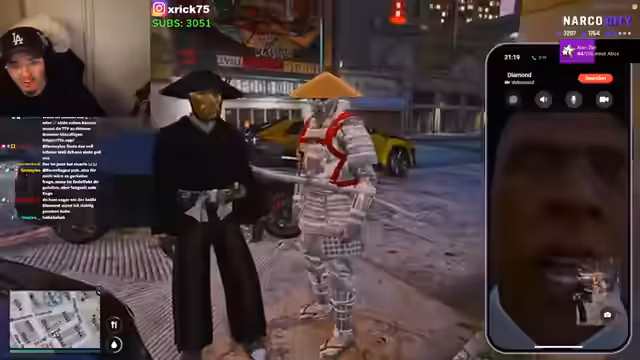 05:36:59Nach einer hitzigen Auseinandersetzung, bei der der Protagonist wütend wegfährt, kommt es zu einer weiteren Konfrontation. Ein Charakter namens Prince wird gesucht und es stellt sich heraus, dass er beim Cat Café ist. Dort kommt es zu verbalen Provokationen und Drohungen, die in einer Verfolgungsjagd münden. Prince fährt in einem Bugatti davon, während der Protagonist versucht, ihn einzuholen. Die Situation wird durch weitere Beleidigungen und Missverständnisse angeheizt. Es wird über die Herkunft und den Status der Charaktere diskutiert, wobei Samurai-Outfits und Zugehörigkeiten zu Gangs wie 'Popolo-Wive' eine Rolle spielen. Die Anspannung steigt, als über einen 'Part 1 von Part 2' gesprochen wird, was auf eine fortlaufende Geschichte hindeutet.