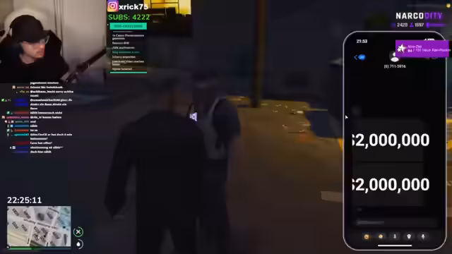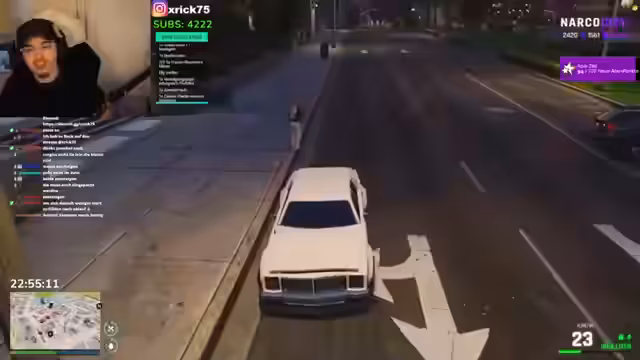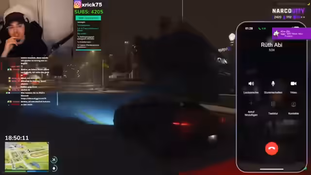 00:28:01Ein Höhepunkt des Streams ist der Besuch in einem Laufhaus. Hier versucht der Streamer, Geschäftspartner wie Diamond zu treffen und VIP-Zutritt zu erhalten. Die Situation eskaliert jedoch, als er beschuldigt wird, ohne Einlass zu sein. Später startet eine wilde Verfolgungsjagd durch die Stadt, bei der er versucht, einen Käufer für den Ehering vor der Polizei und Verfolgern in Sicherheit zu bringen, was zu einem dramatischen Höhepunkt führt.