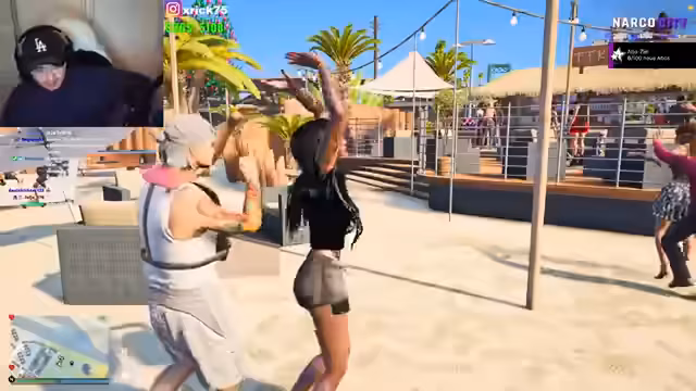 01:48:00Der Streamer wechselt abrupt das Szenario und nimmt die Rolle eines Barkeepers in einer Tiki-Bar an. Er interagiert mit virtuellen Gästen, wirbt für eine anstehende Salsa-Party und stellt Cocktails wie Mojito und Sex on the Beach her. Diese Rollenspiel-Einheit dient als Ablenkung und als Möglichkeit für den Streamer, in einer entspannten, fiktiven Umgebung zu agieren.