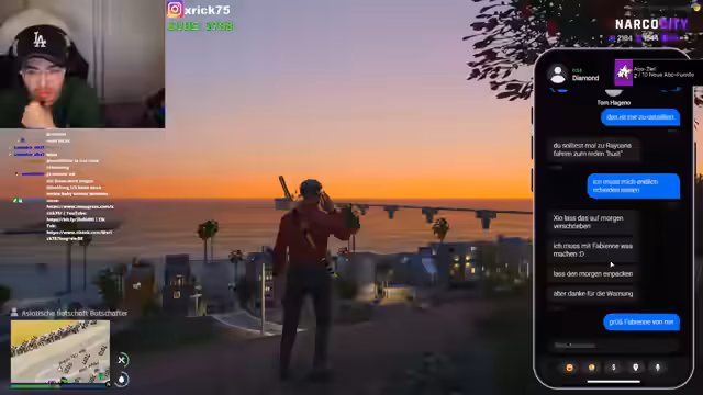 02:35:33Ein Heli wird von Faltenberg geklaut, und der Streamer sitzt nun darin. Er trifft auf Chaoling, mit dem er diverse Dinge besprechen möchte. Dabei wird ein Treffen mit Santana geplant, um eine Villa für eine Session zu nutzen und über Geschäfte zu reden. Die Pläne sind jedoch vage, und es wird auf eine baldige Verabredung gedrängt.
