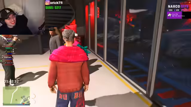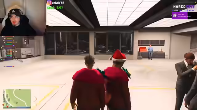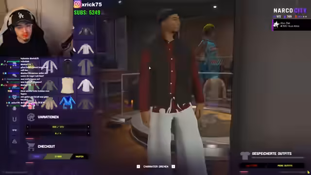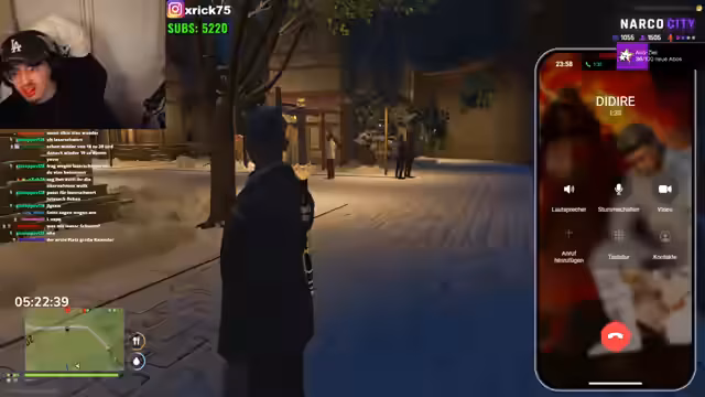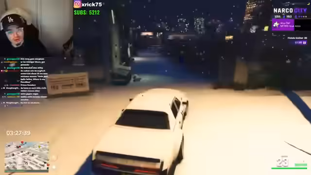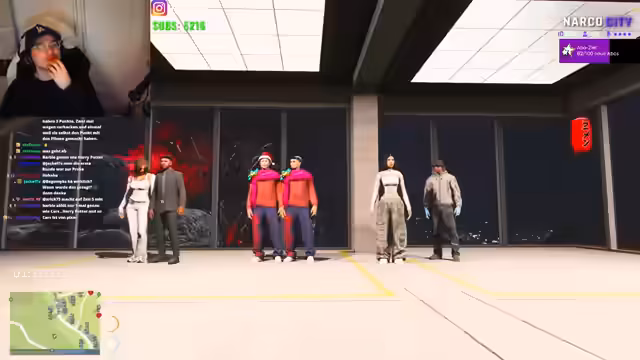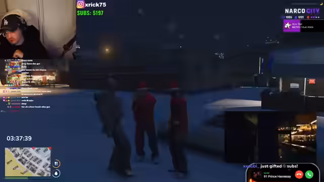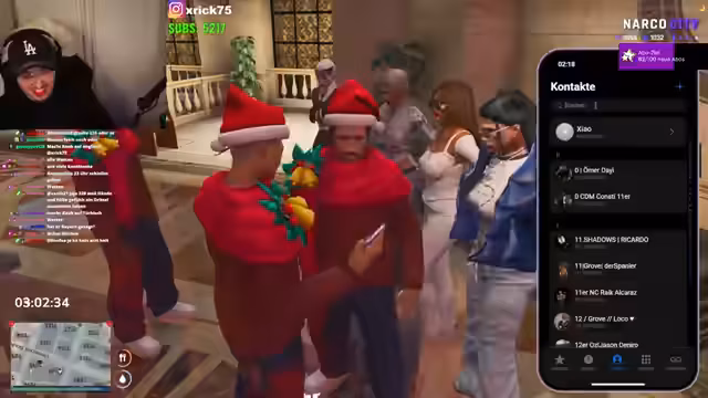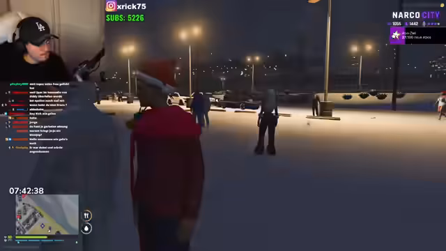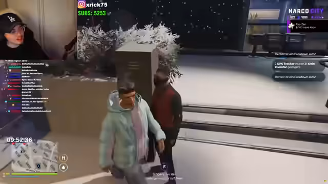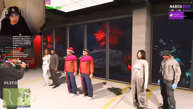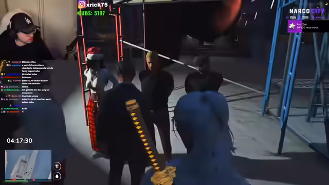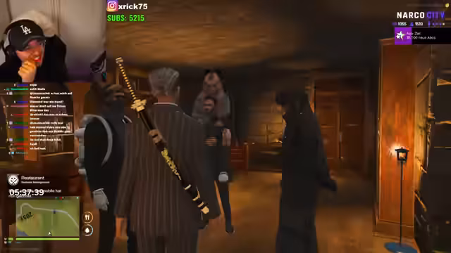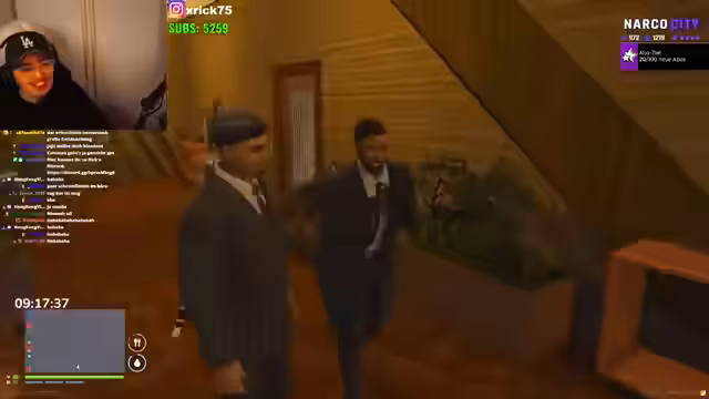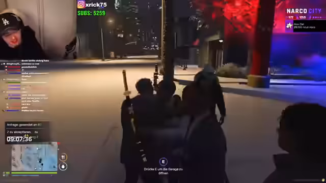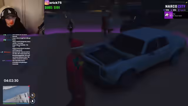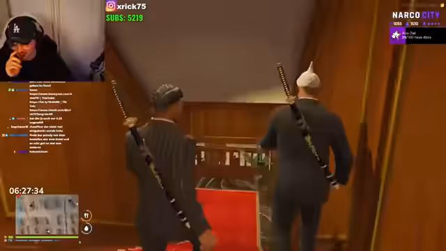 03:03:34Der Streamer kündigt eine Waffenbestellung an, die mit 'Reik' ausgehandelt wurde: 25 'Advanced'-Gegenstände für 12,5 'schwarz'. Er erwähnt eine bevorstehende Lieferung heute Abend. Später plant er mögliche Angriffe auf Gruppen wie 'Santana' oder 'Sicario', wobei er Camouflage-Taktiken und Samurai-Bewaffnung diskutiert. Er stimmt mit einem Partner ab, dass die Lieferung mit 'Epsilon' verbunden wird, und es folgt eine Absprache für eine Übergabe im Hotel. Die Koordination zeigt strategische Vorbereitungen für Konflikte in NarcoCity.