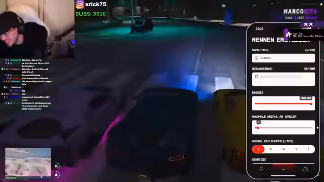 02:09:34Ein hochdotiertes Rennen auf der 'Ölfelder'-Strecke beginnt, bei dem eine Million Einsatz pro Person fällig ist. Der Streamer und seine Teilnehmer sind emotional aufgewühlt und motiviert. Nach der Rennen führt der Streamer seinen Gewinn an und schlägt sofort ein weiteres Rennen auf einer neuen, schwierigeren Strecke namens 'Flughafen' vor, um den Sieg zu wahren und das Geld zu vermehren.