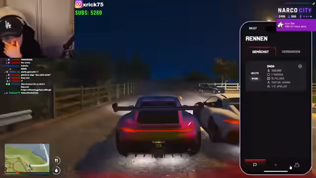 07:47:05Die Konzentration verlagert sich auf Autorennen in der Spielwelt. Ein Rennen wird initiiert, bei dem es ums Prestige und den Sieg geht. Es kommt zu technischen Problemen und Diskussionen über die Fairness und die Fahrzeugleistungen. Trotz anfänglicher Rückschläge und Ego-Kämpfe bleibt der Wettbewerbsgeist und der Spaß an der Veranstaltung erhalten.