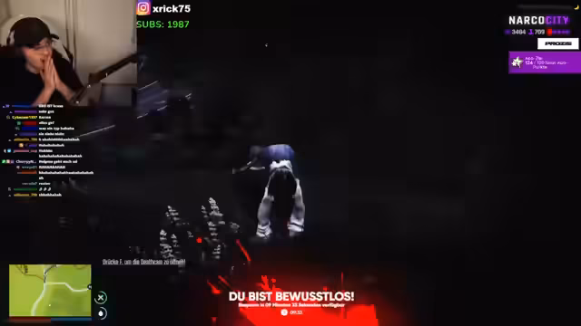00:44:07Während des Streams kommt es zu einer dramatischen Konfrontation, bei der eine Person beinahe einen Suizid begeht. Der Streamer agiert besorgt und versucht, die Person zu beruhigen. Der Tonfall wird ausgesprochen emotional und lebensmüde, was eine ernste und aufwendige Rettungsaktion nach sich zieht, bei der der Streamer die Person mit dem Helikopter aus misslicher Lage befreit.