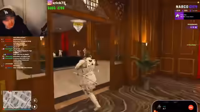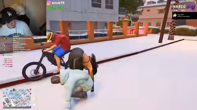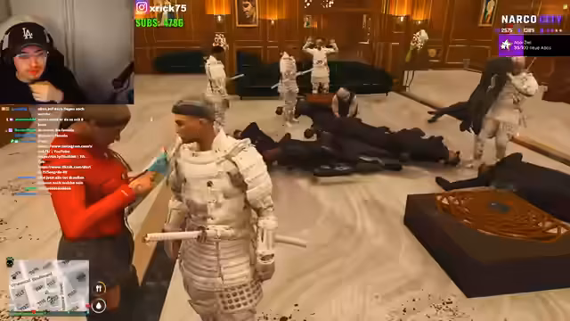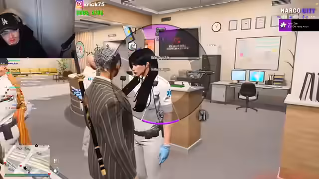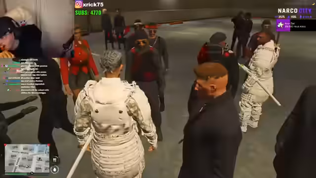 07:46:40In einer improvisierten Therapiesitzung bei den 'Anonymen Alkoholikern' thematisiert ein Charakter seine Fentanyl-Abhängigkeit und Entzugserfahrungen. Die eigentlich ernste Situation wird durch absurd-komische Einwürfe unterbrochen, als andere Spieler scheinbar wahllos nach Frauen rufen. Später eskaliert eine Autofahrt mit Mitgliedern rivalisierender Gangs (Ballas, El Barrio Loco), die in einer Geiselnahme mündet. Die Gefangenen sollen ein Klavierstück vortragen, bevor technische Verbindungsprobleme die Situation abrupt beenden.