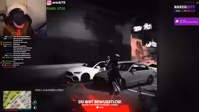 01:28:09Nach dem bewaffneten Vorfall flieht die Gruppe aus dem Club. Der Streamer berichtet, dass sie von einem Angreifer in einem schwarzen Anzug beschossen wurden und nicht weiterfahren können, da ihr Auto Reifenprobleme hat. Er kontaktiert seine Crew, um den bewusstlosen Abi zu finden und ihm Hilfe zu holen, und macht sich auf den Weg in ein Lazarett.