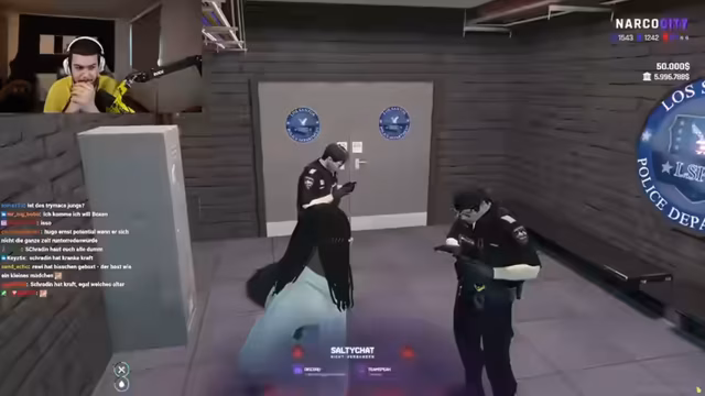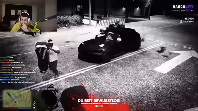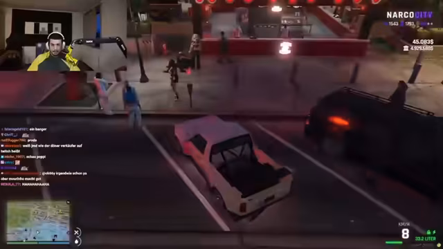 03:16:12Die Situation eskaliert in eine dramatische Verfolgungsjagd. Ein 'feiger Angriff' wird gegen den 'Kaiser' gerufen, und mehrere blaue Fahrzeuge verfolgen die Gruppe. Die Personen fliehen zum Polizeirevier, wo sie von der Polizei kontrolliert und festgenommen werden. Es kommt zu einer verbalen Auseinandersetzung, in der die Verfolgten behaupten, unschuldig zu sein und nur auf dem Weg zu einem Döner gewesen zu sein, während die Polizei sie als 'Bondage Gang' verdächtigt und mit scharfen Waffen bedroht hat.